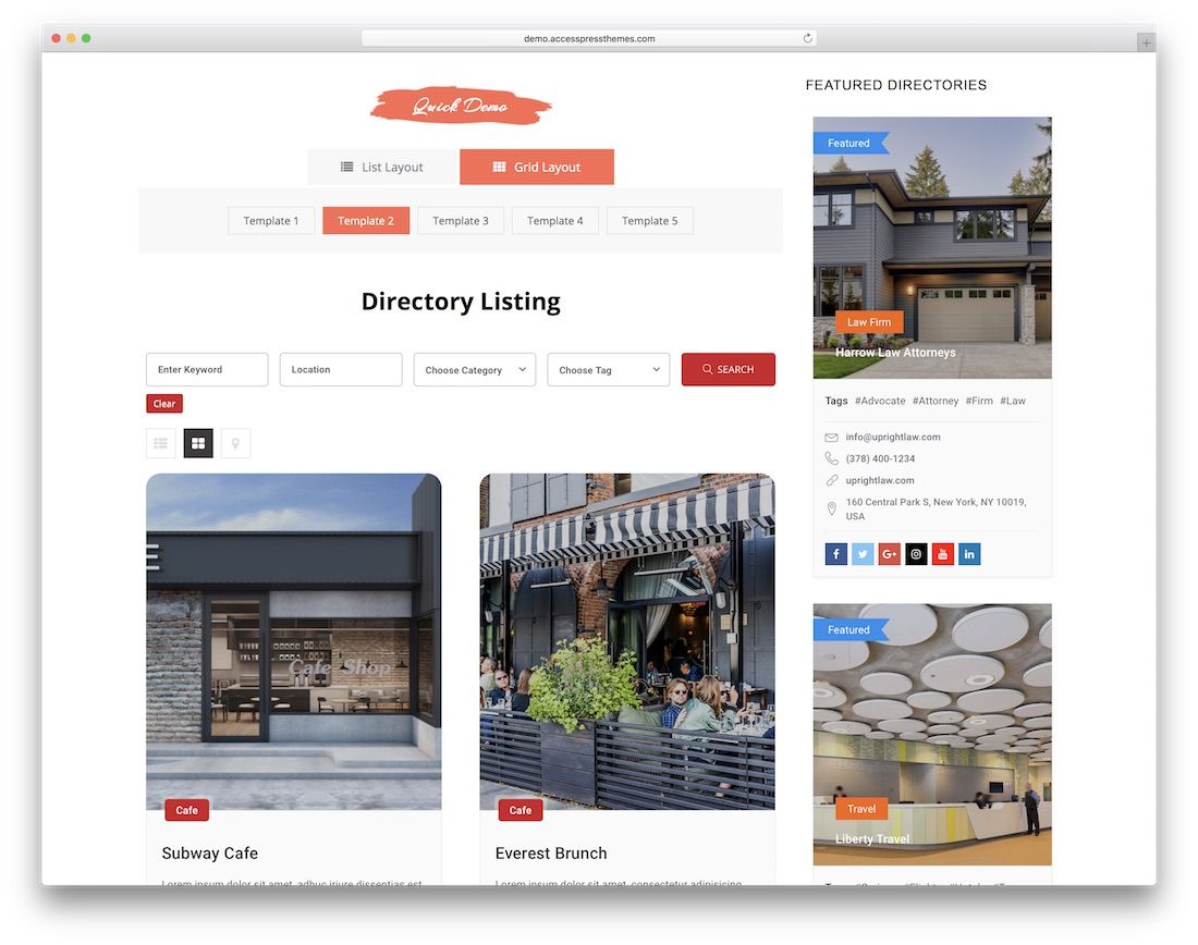 المكون الإضافي Web 2.0 Directory هو مكون إضافي سريع الاستجابة يسمح للمستخدمين بإنشاء أي نوع من مواقع دليل الأعمال عبر الإنترنت مثل الإعلانات المبوبة أو مواقع قوائم العقارات أو مواقع الصفحات الصفراء. خيار البحث داخل دائرة نصف قطرها يجعلها مثالية للدليل المحلي.