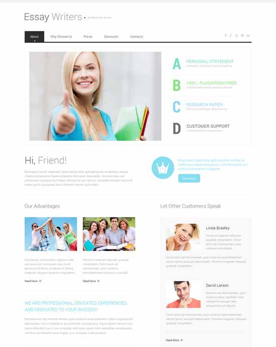 تم إنشاء الموضوع لشركات كتابة المحتوى. تهيمن نغمات الرمادي الفاتح والأزرق على تخطيطها. يتم وضع أزرار الحث على اتخاذ إجراء مباشرة في رأس الصفحة ، حتى لا يفوتك الزوار. جميع النصوص الموجودة في صفحة قالب موقع Essay Writer واضحة ومقروءة بوضوح. يتم توفير قسم "لماذا تختارنا" برموز مستديرة بسيطة. تأتي شهادات العملاء في شكل مؤشر. الموضوع غني بالمحتوى ، لذلك حتى الصفحة الرئيسية ستوفر الكثير من المعلومات للمستخدم.