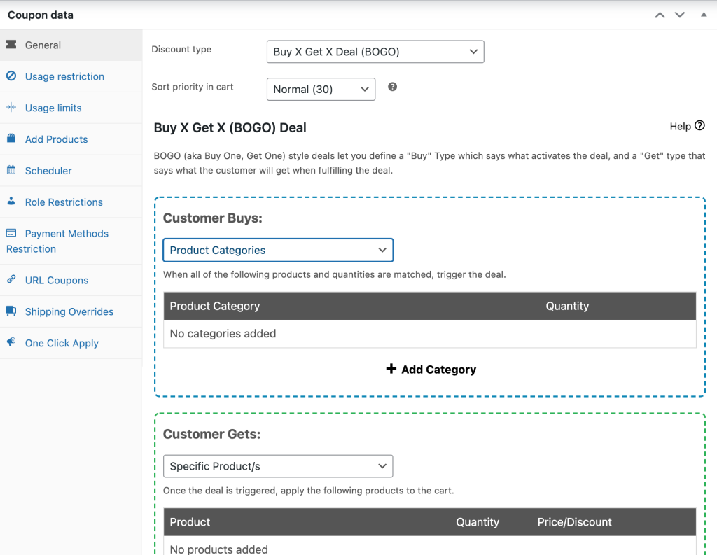 إذا انتقلت إلى عام واخترت نوع الخصم Buy X Get X Deal (BOGO) ، فستتمكن من إنشاء خصومات لمنتجات معينة أو فئات منتجات في متجرك: