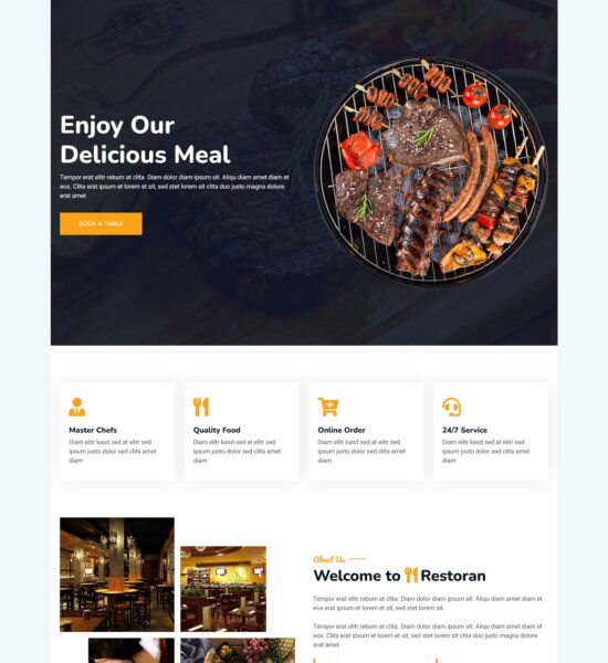 Restoran هو قالب موقع ويب Bootstrap Restaurant مجاني ونظيف وحديث مصمم خصيصًا للمطاعم والبارات والمقاهي والبيسترو والمقاهي والأطعمة الآسيوية والوجبات السريعة الأمريكية والبيتزا والمأكولات الإيطالية والبرجر والسوشي والمعكرونة وأسواق الأسماك والمخابز وأي المواقع الأخرى ذات الصلة بالطعام. قم ببناء موقع الويب الخاص بعملك الغذائي باستخدام قائمة طعام Bootstrap المجانية هذه ونموذج الطلب بسهولة.