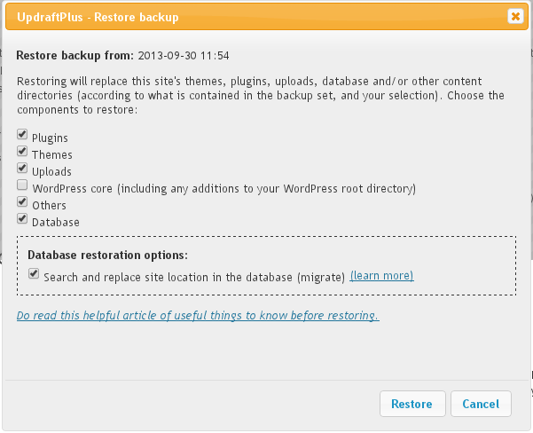 - قم باستعادة النسخ الاحتياطية مباشرة من لوحة تحكم WordPress الخاصة بك