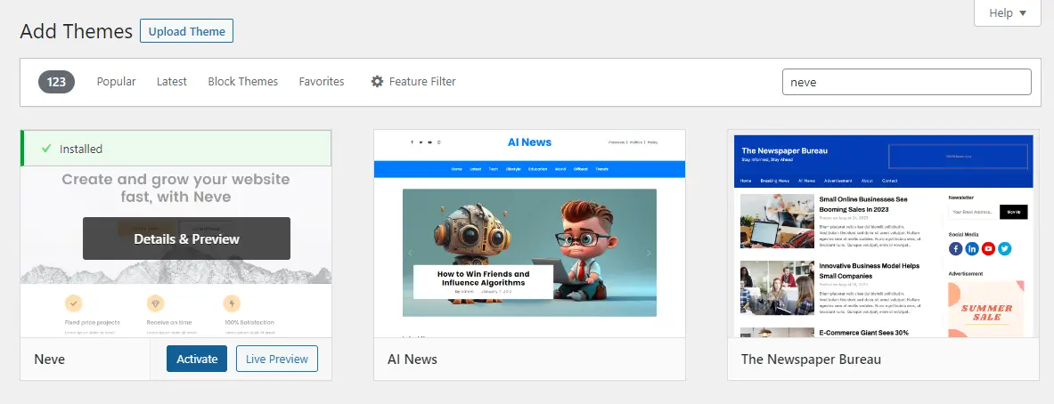 لتثبيته ، انتقل إلى المظهر> السمات في لوحة معلومات WordPress الخاصة بك وحدد إضافة جديد . بعد ذلك ، ابحث عن "Neve" وانقر على "تثبيت " ، متبوعًا بـ "تنشيط" :