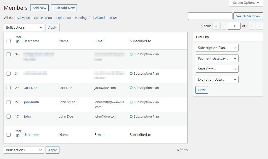 يمكنك أيضًا عرض جميع الأعضاء المشتركين من خلال الانتقال إلى اشتراكات الأعضاء المدفوعة ← الأعضاء .