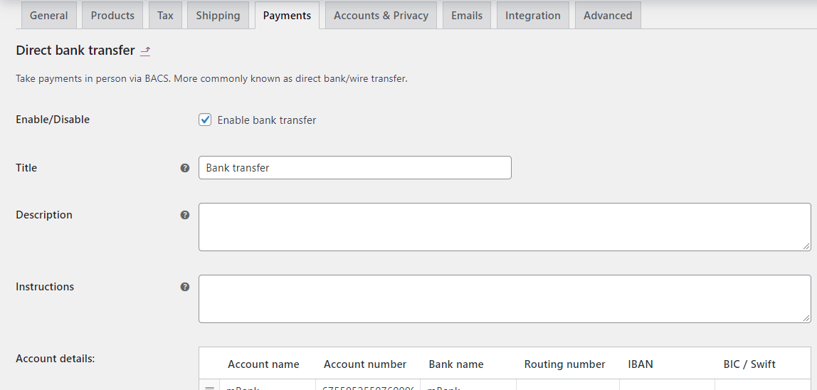 عندما تنقر على اسم الطريقة (أو زر على اليمين) ، ستتمكن من تحديد خياراتها. على سبيل المثال ، بالنسبة للتحويل المصرفي المباشر ، يمكنك إضافة العنوان والوصف وأرقام الحساب المصرفي والتعليمات التي يتلقاها العميل بعد الشراء حول الخطوات الإضافية للأمر والدفع.
