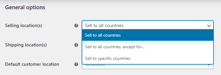 اختر مواقع البيع . حدد ما إذا كنت تريد البيع في WooCommerce لجميع البلدان أو مواقع محددة أو جميع البلدان باستثناء بعضها.