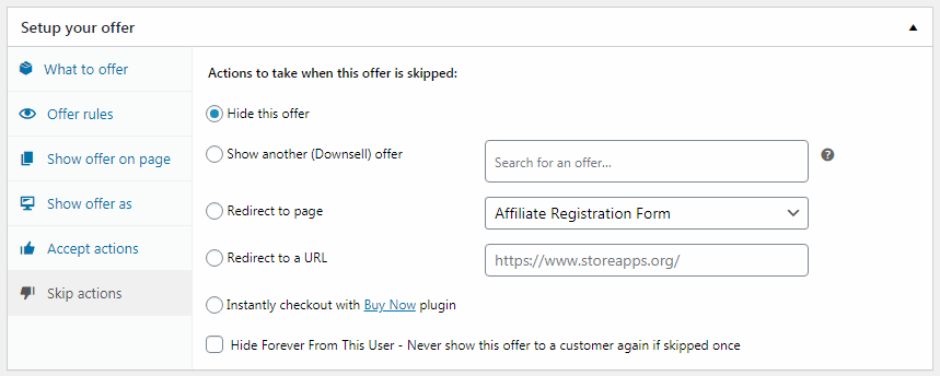 Accept actions، بشكل افتراضي ،Add the offered product to cart. يمكنك اختيار تمكين الدفع بنقرة واحدة باستخدام Buy Now. - اختر ما يجب فعله في حالة تخطي / رفض العميل لهذا العرض.