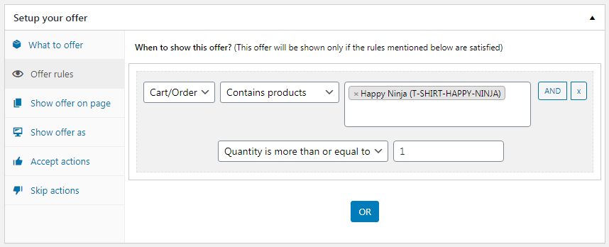 الخطوة 3 - أحد أفضل الميزات التي توفرها العروض الذكية هو اختيار استهداف العروض. ضمن Offer rules ، حدد Cart/Order > Contains products ، واختر Happy Ninja وقم بتعيين Quantity is more than or equal to 1.