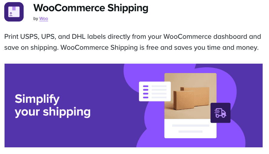 WooCommerce Shipping by Woo هو مكون إضافي مجاني ومدمج مصمم للتجار المقيمين في الولايات المتحدة والذين يريدون طريقة صديقة للميزانية لإدارة الشحن. فهو يتكامل مباشرة مع USPS وDHL، مما يسمح لأصحاب المتاجر بطباعة ملصقات الشحن والوصول إلى الأسعار المخفضة مباشرة من لوحة تحكم WooCommerce. وهذا يجعله خيارًا مناسبًا للشركات الصغيرة التي ترغب في خفض التكاليف دون المساس بالكفاءة.