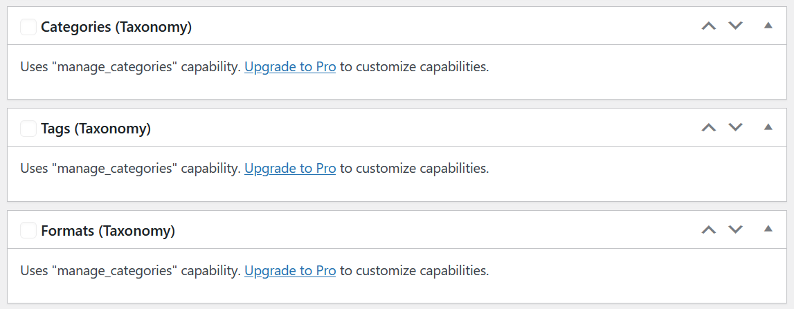 Es gibt jedoch bestimmte Funktionalitäten, die nur mit der Pro-Version verfügbar sind. Dazu gehören WordPress-Rollenänderungsberechtigungen in Bezug auf Kategorien, Tags (Taxonomien) und Formate.
