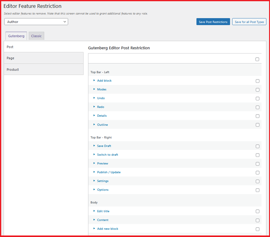 Zu den bemerkenswerten Funktionen gehört die Möglichkeit, bestimmte Bereiche des Gutenberg- und Classic-Editors für Ihre Benutzerrollen einzuschränken.