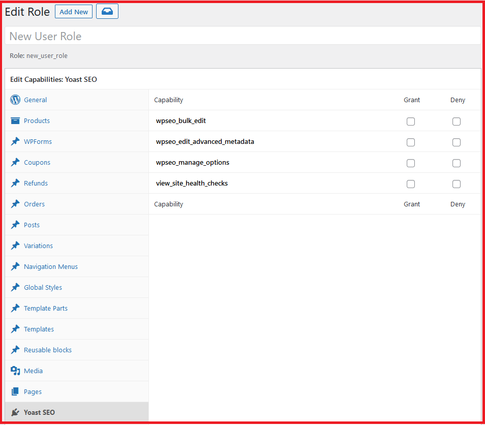 Klicken Sie dann auf die Benutzerrolle, für die Sie die Berechtigungen bearbeiten möchten. Sie landen auf einer Seite mit einer ziemlich benutzerfreundlichen Oberfläche. Sie können Berechtigungen in zwei Modi bearbeiten: Zulassen und Verweigern.