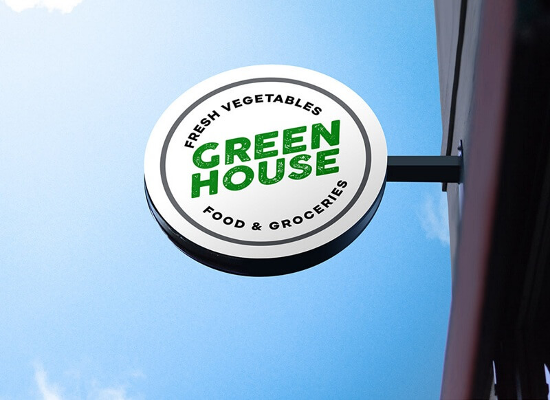 Dies ist ein Schildermodell, das an der Wand eines Geschäfts hängt. Verwenden Sie die PSD-Vorlage, um Ihre eigene Geschäfts- oder Markenbeschilderung zu erstellen, um sie in einer realistischen Umgebung im Freien zu präsentieren und Ihre Kunden zu beeindrucken.