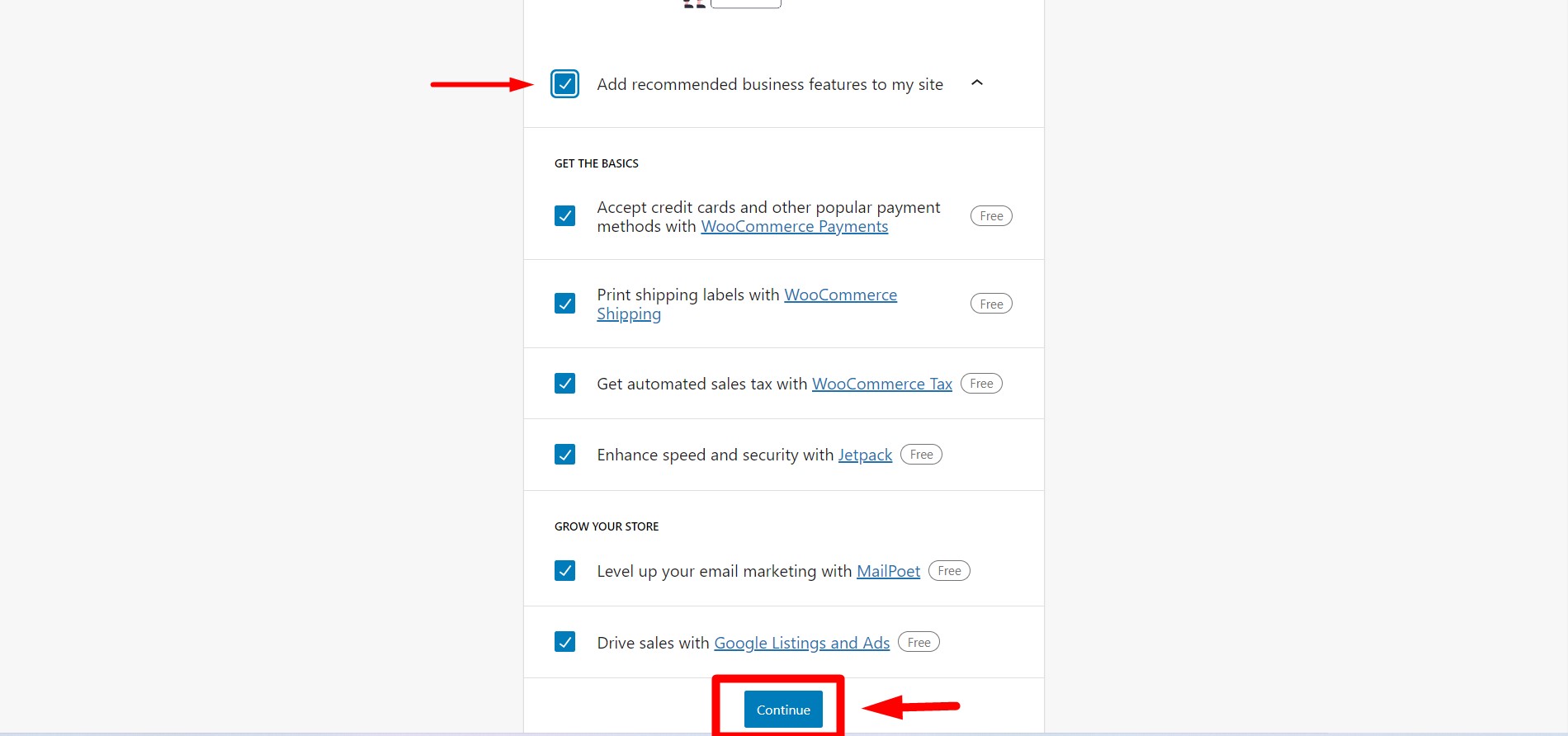 Nachdem Sie auf Weiter geklickt haben, werden Ihnen einige kostenlose Funktionen von WooCommerce angeboten. Diese Funktionen sind standardmäßig ausgewählt. Wenn Sie diese kostenlosen Funktionen nicht erhalten möchten, können Sie einfach das erste Häkchen deaktivieren. Diese Funktionen sind nützlich, um ein dynamisches Geschäft aufzubauen, daher wird es empfohlen. Klicken Sie danach einfach auf „Weiter“, um zum nächsten Schritt zu gelangen.