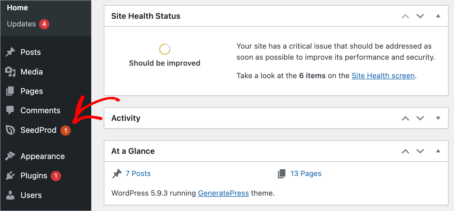 Nachdem Sie das Plugin installiert haben, gehen Sie zu Ihrem WordPress-Dashboard und klicken Sie auf die SeedProd- Schaltfläche im linken Bereich.