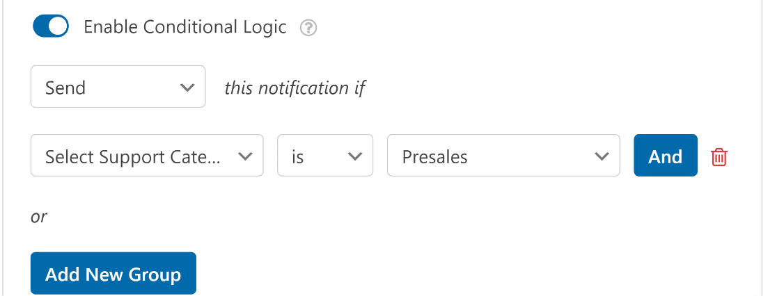 Nachdem Sie die E-Mail angepasst haben, scrollen Sie nach unten und verwenden Sie die Umschaltfläche neben Enable Conditional Logic .