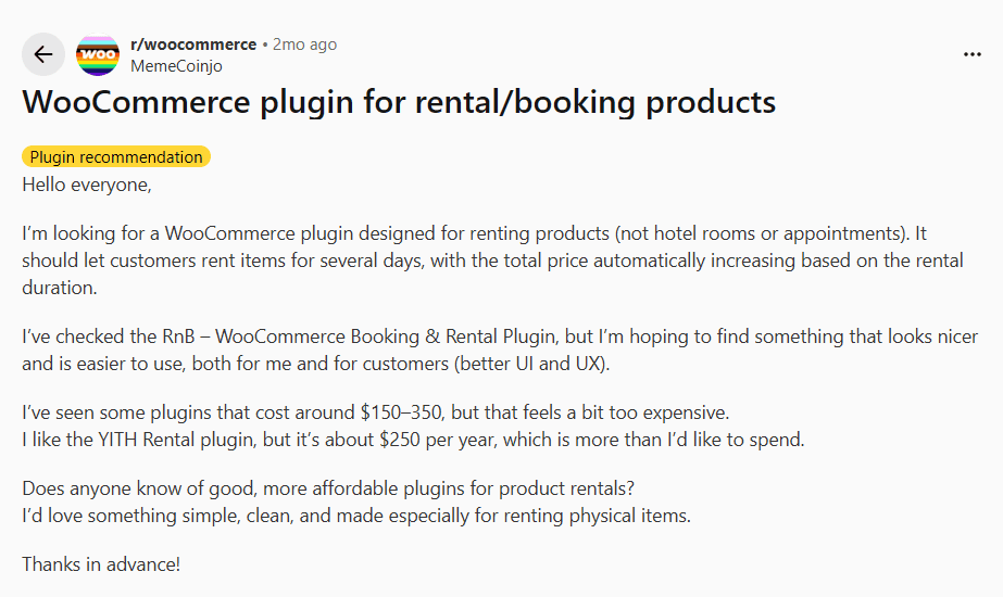 Fragen auf Reddit wie „ Kennt jemand gute, günstigere Plugins für die Produktmiete? “ tauchen auf, wenn Ladenbesitzer erkennen, dass Kalender allein keine Lösung für die inventarbasierte Vermietung bieten.