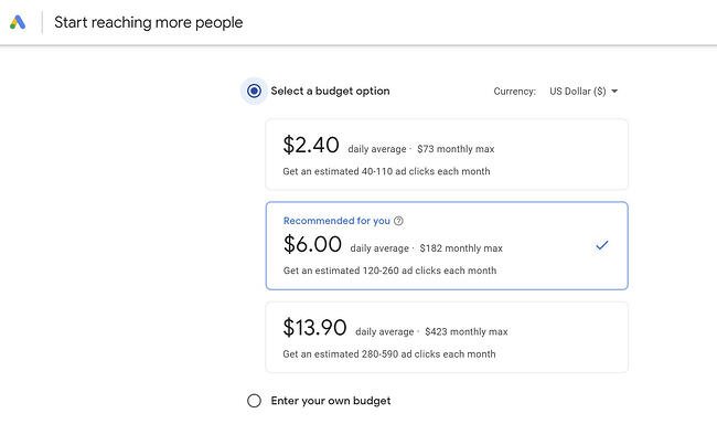 在这里,您将使用 Google 提供的预算选项或输入特定预算。