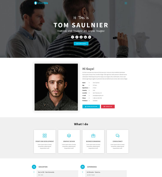 MeetMe Lite ist die kostenlose Version der MeetMe-Lebenslauf-HTML-Vorlage von GrayGrids. Die kostenlose Version enthält dieses elegante Lebenslauf-Design mit fester Kopfnavigation (die reibungslos zu den Abschnitten scrollt), Biografie mit Profilfoto, Bildungschronik, Berufserfahrung, Bildergalerie mit Lightbox-Funktion, Statistiken und Details. Kontakt.