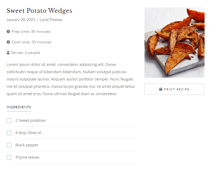 Sie werden feststellen, dass es in der rechten Ecke Schaltflächen gibt, um das Rezept auf Pinterest zu teilen, aber auch direkt auszudrucken. Diese Funktionen können entscheidend dafür sein, wie Besucher Ihre Rezeptseite wahrnehmen. Und es versteht sich von selbst, dass dies nur ein Bruchteil dessen ist, was das TinySalt-Theme an Funktionen bietet. Schauen Sie sich die Demo unten an, um ein tieferes Gefühl nicht nur für Rezeptseiten, sondern auch für Kategorien und die Homepage zu bekommen.
