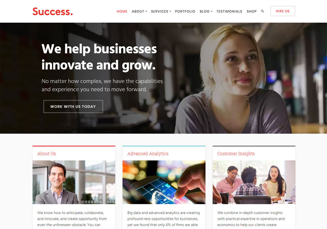 Success es un tema de WordPress para servicios de coaching empresarial y profesional con un diseño limpio y moderno. Utiliza increíbles funciones y complementos para ayudarlo a destacarse entre la multitud.