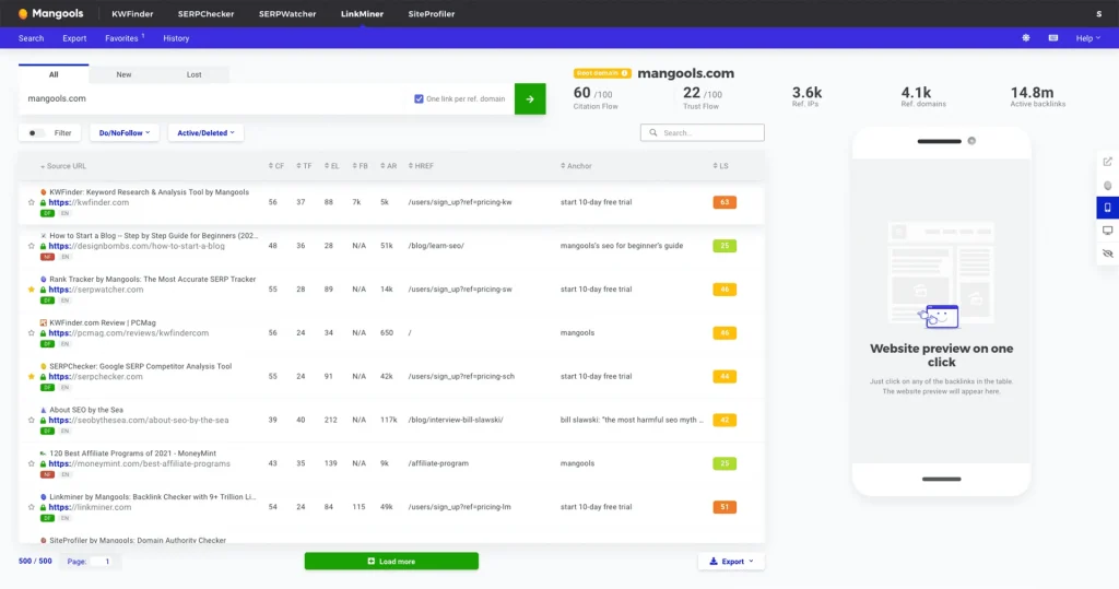 El siguiente es LinkMiner en Mangools, que es una herramienta de análisis de backlinks que te permite encontrar poderosos backlinks que puedes replicar.