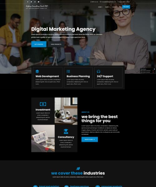 Business Consulting Dark es un tema gratuito de consultoría de WordPress orientado a la consultoría, el marketing digital, los negocios y los servicios financieros. Es la plataforma perfecta para crear un sitio web profesional para consultores de negocios, contadores, firmas de inversión, seguros, asesores fiscales, nuevas empresas, asesores financieros, marketing y cualquier otra empresa de consultoría. Este es un tema de sitio web multipropósito versátil, experto en tecnología y receptivo que fue desarrollado para satisfacer todas las necesidades comerciales. Este tema también se puede utilizar para empresas, negocios, blogs personales, bufetes de abogados, banca, comercio electrónico, blogs de moda, yoga, organizaciones benéficas, gimnasios, viajes, noticias, educación, transporte y cualquier otra necesidad empresarial general.