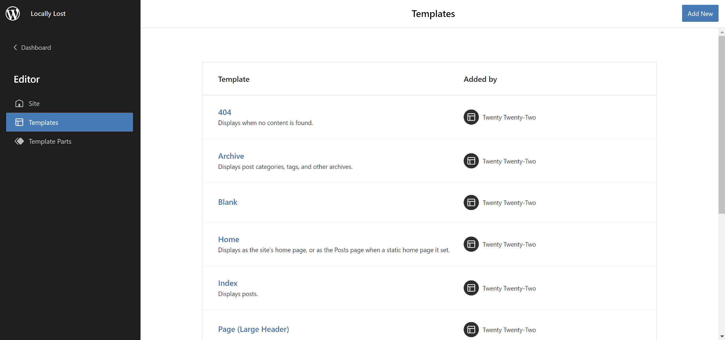 No parece haber una forma de agregar plantillas personalizadas, como una categoría o un archivo de autor. Al hacer clic en el botón "Agregar nuevo" se presentan opciones para una página principal y una plantilla de búsqueda cuando se usa el tema Twenty Twenty-Two.