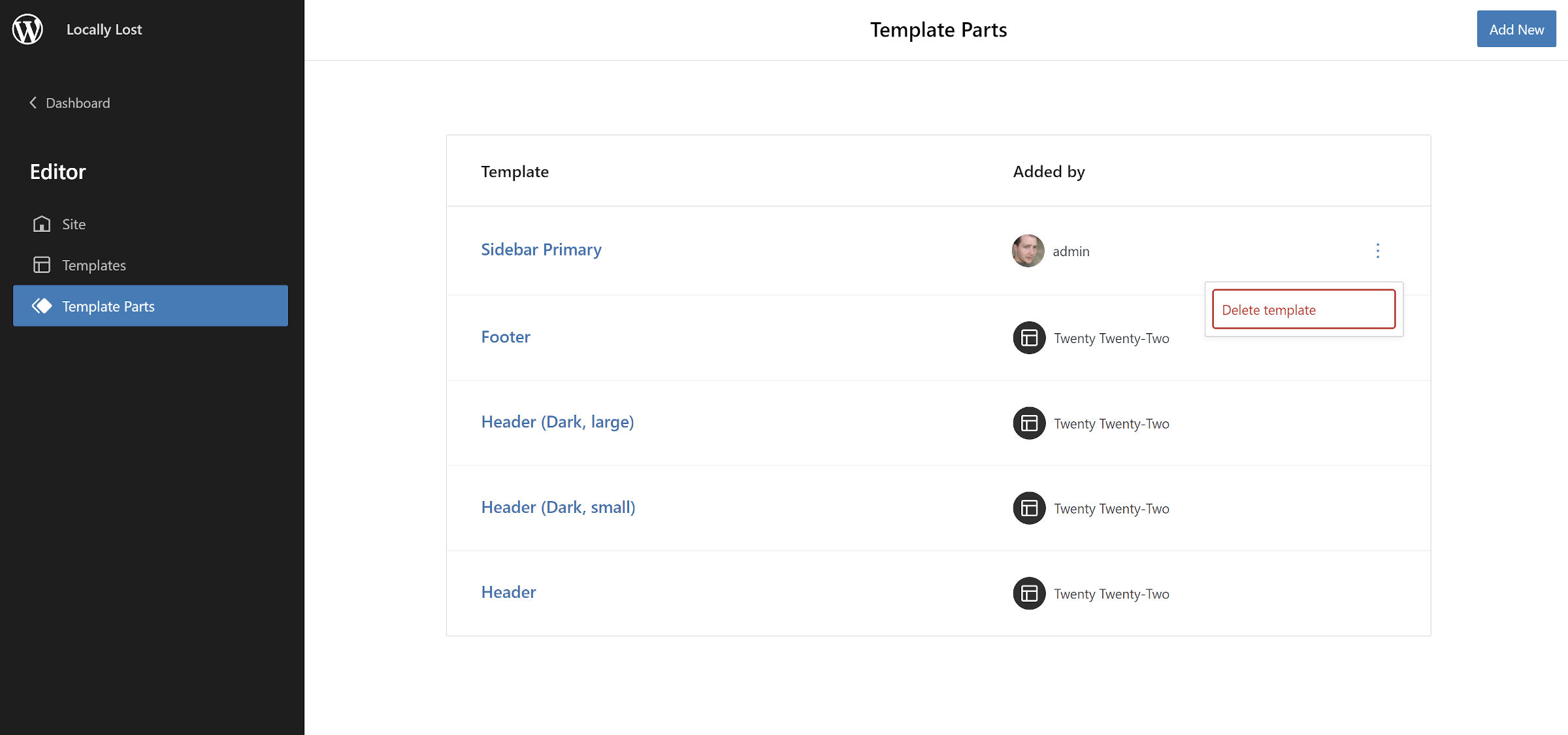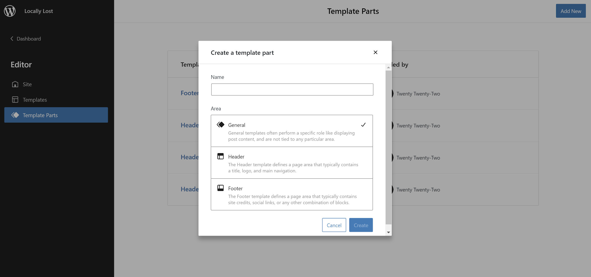 Los usuarios pueden darle un nombre personalizado y elegir entre tres áreas permitidas: general, encabezado y pie de página. Después de crear una nueva pieza, los usuarios acceden al editor.