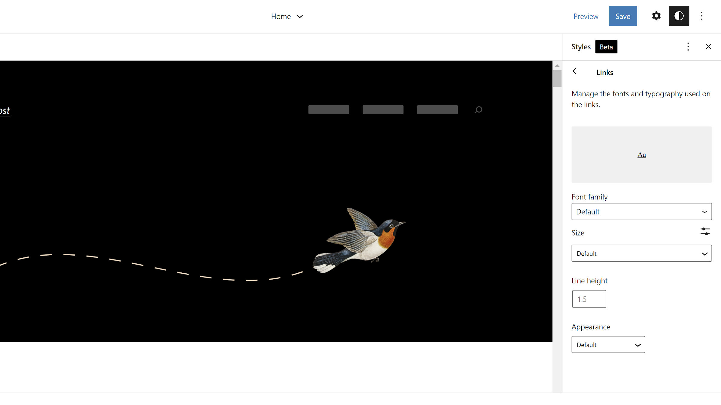 El panel de estilos globales también divide las opciones de tipografía entre texto y elementos de enlace, lo que abre la puerta a otros elementos HTML en el futuro.