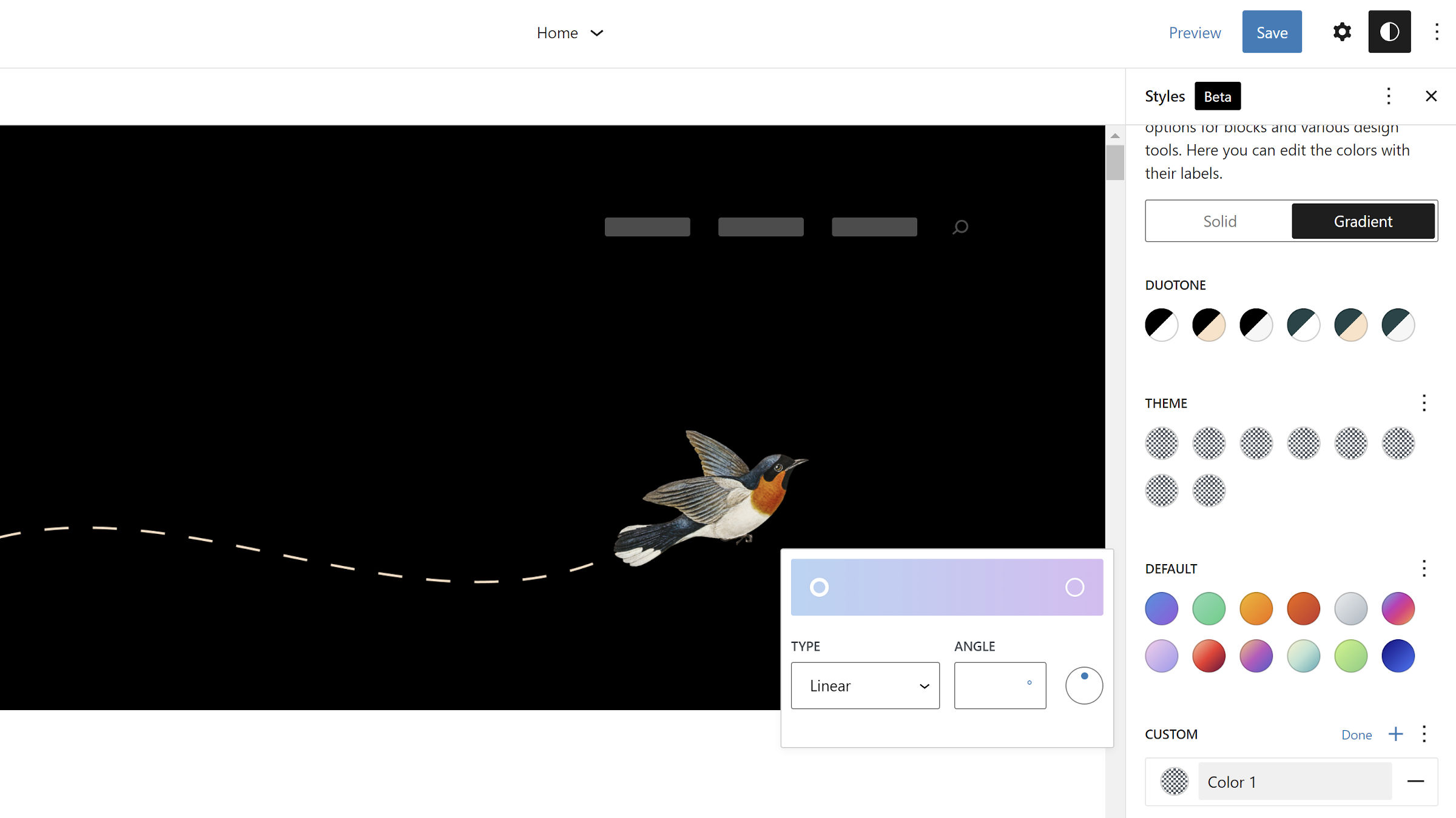 Los usuarios ahora pueden definir degradados personalizados a través de la sección de la paleta de colores en la barra lateral de estilos globales. Estos estarán disponibles en todo el sitio y no están vinculados al tema.