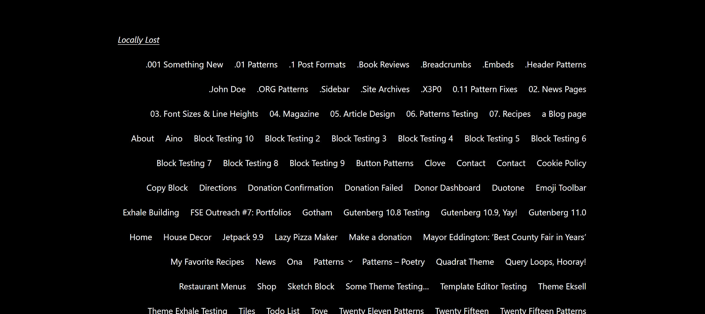 La última versión introdujo una alternativa para el bloque de menú de navegación vacío. En última instancia, si no se encuentra ningún menú, se mostrará el bloque Lista de páginas. Dependiendo de cuántas páginas tenga el sitio de un usuario, esto puede salirse de control rápidamente, como se muestra en la siguiente captura de pantalla de Twenty Twenty-Two: