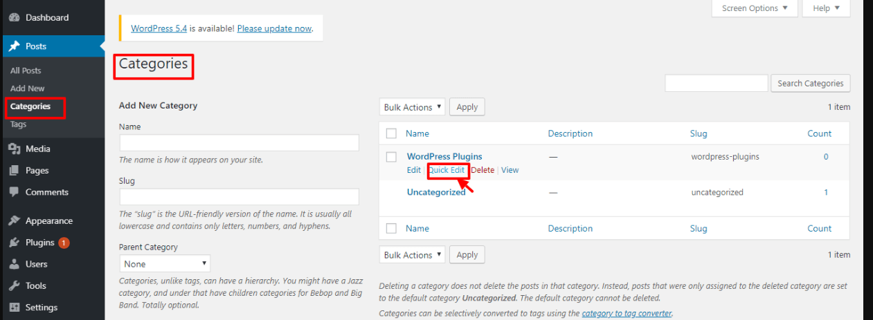 En WordPress, puede crear categorías para sus publicaciones. Puede agregar fácilmente categorías a sus publicaciones de WordPress. Puede encontrar las categorías que desea usar yendo a la sección Publicaciones de su panel de administración de WordPress. Incluya un nuevo nombre de categoría , slugs, descripción y si el elemento está relacionado o no. Al hacer clic en Agregar categoría, puede agregar una nueva categoría a su lista. Pase el mouse sobre una categoría existente y elija Eliminar en el menú desplegable.