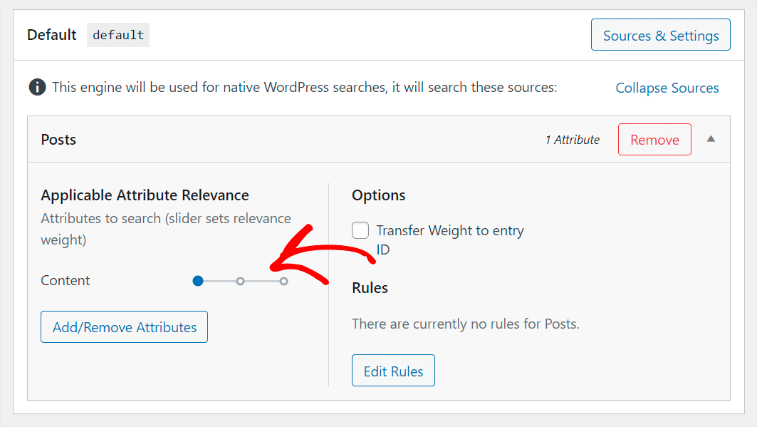 Agreguemos peso de relevancia al atributo Contenido moviendo el control deslizante completamente hacia la derecha. De esta manera, WordPress le dará la máxima prioridad a este atributo cuando busque.