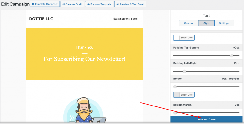 La personalización es fácil y puede agregar/eliminar imágenes y cualquier cosa que desee transmitir su mensaje además de agregar un enlace o un botón CTA. Una vez que haya terminado de editar, haga clic en Guardar y cerrar .