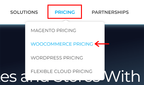 Ir al sitio web original de Nexcess. Allí, en la navegación, puede ver el menú Precios . Pase el cursor sobre eso y seleccione la opción Precios de WooCommerce para abrir la página de precios.
