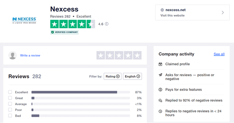 El TrustScore de Nexcess.net en Trustpilot es de 4,6 sobre 5 estrellas . ¡Eso es bueno! Y la calificación se calcula en base a 282 opiniones de usuarios. Entre los cuales el 87% de ellos dicen que es excelente. Además, consulte las reseñas de usuarios más recientes en Nexcess.