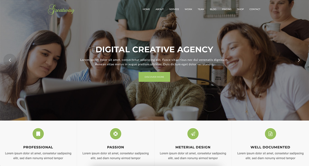 Greatway es un tema de WordPress rentable que se inclina hacia el lado más simple del diseño de materiales.