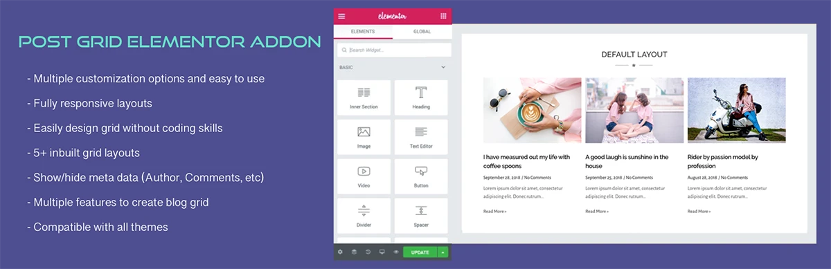 Post Grid es un popular complemento de creación de páginas de Elementor que le permite mostrar publicaciones en forma de cuadrícula. Este complemento de cuadrícula de WordPress incluye un diseño completamente receptivo para presentar su material de manera ordenada y estructurada.
