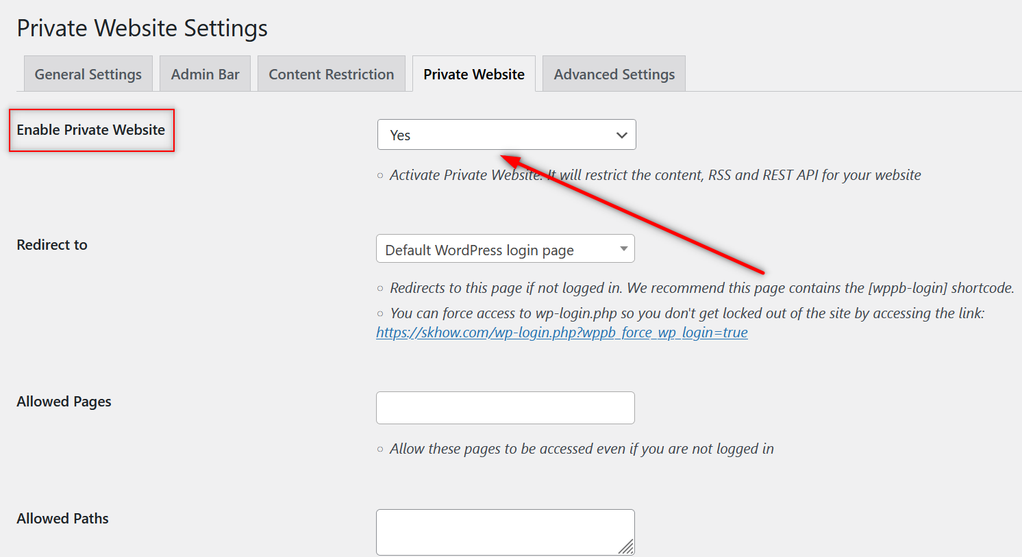 Haga clic en el menú desplegable Habilitar sitio web privado y configúrelo en Sí .