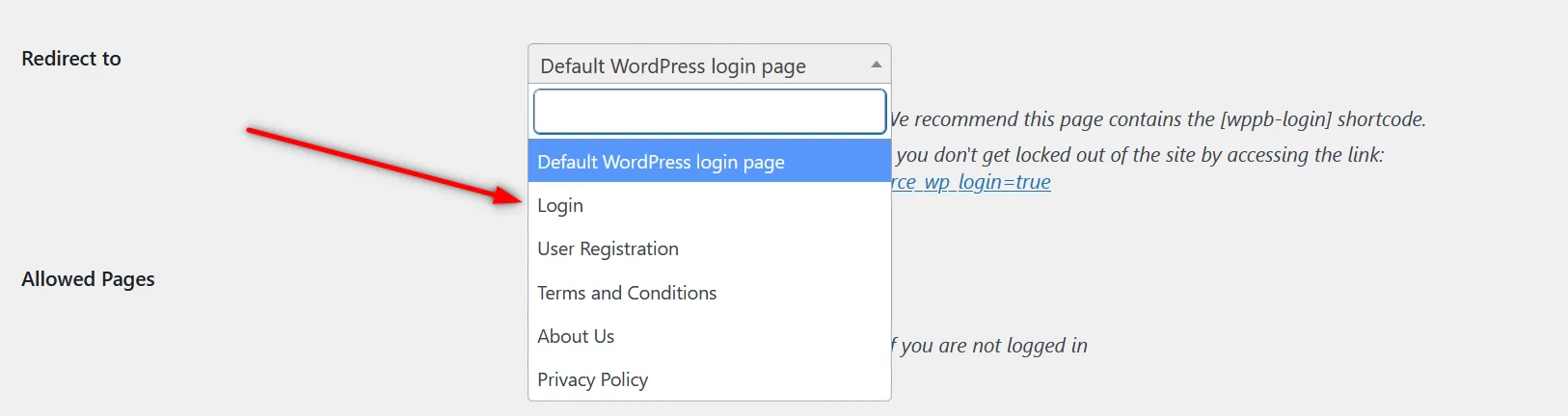 La segunda opción a continuación que le permite redirigir a sus usuarios cuando visitan su tienda. De forma predeterminada, está configurado en la página de inicio de sesión predeterminada de WordPress .