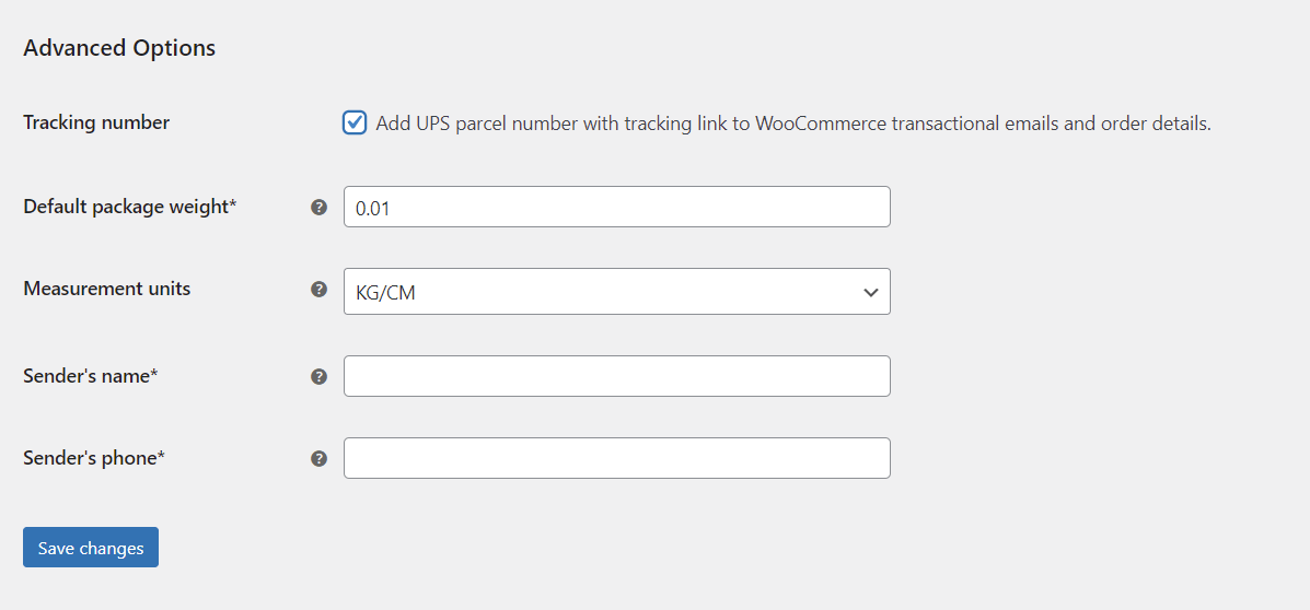 Ahora lo más importante. Como prometí, para habilitar UPS Shipment Tracking en WooCommerce solo necesita un clic, básicamente marcando una casilla de verificación. En la Configuración de la API , encontrará las Opciones avanzadas . Allí, tiene la casilla de verificación Número de seguimiento . Simplemente márquelo para agregar el número de paquete de UPS con el enlace de seguimiento a los correos electrónicos transaccionales de WooCommerce y los detalles del pedido . ¡Recuerda guardar los cambios!