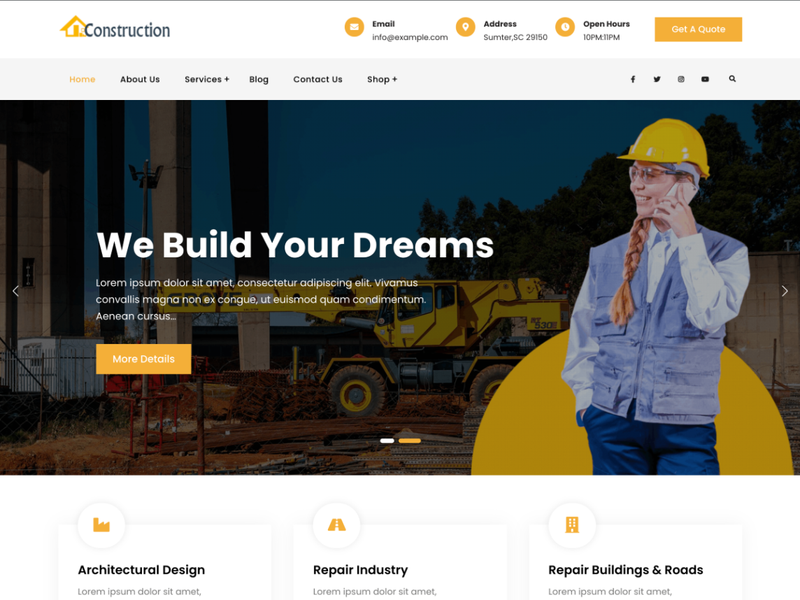 Ce thème comporte une section de services prédéfinie, une section de témoignages et une section de portefeuille, qui sont essentielles pour afficher votre contenu et attirer instantanément vos visiteurs. Il fonctionne bien avec les constructeurs de pages populaires tels que WPBakery Visual Composer, SiteOrigin, etc. En ajoutant d'autres plugins externes gratuits et premium, vous pouvez ajouter des fonctionnalités supérieures à votre site Web et afficher votre entreprise de construction.
