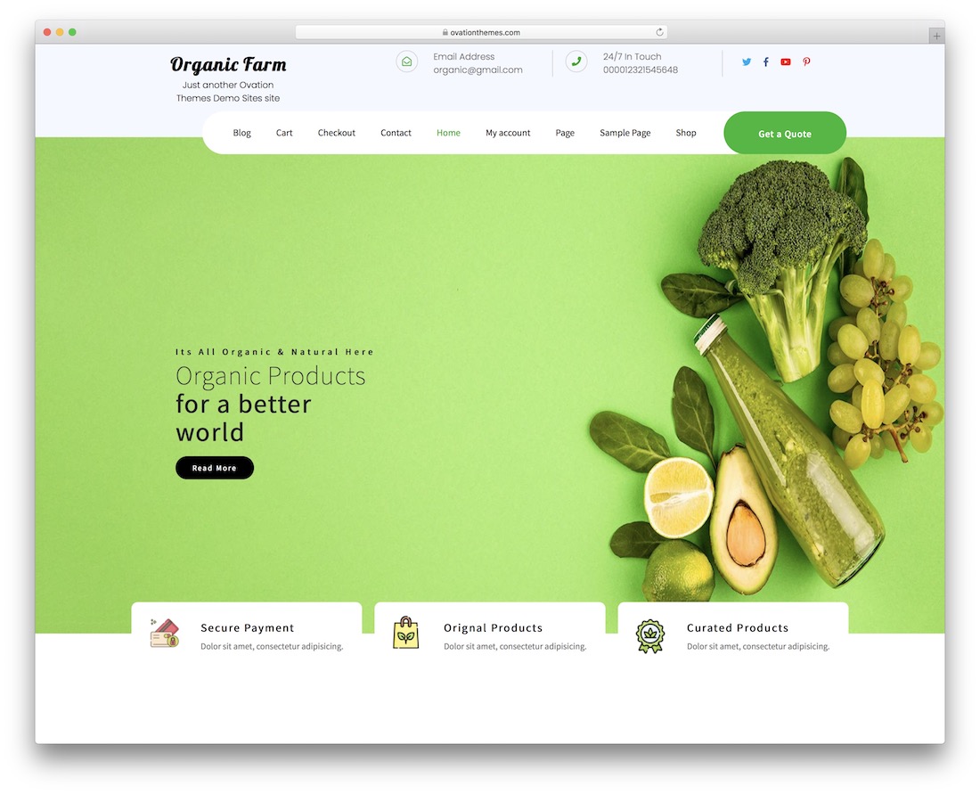 Que vous souhaitiez créer un site Web de commerce électronique pour une ferme réelle ou un magasin d'alimentation générale, Organic Farm vous permet de l'aborder en toute confiance. Le design épuré et moderne garantit de présenter tous vos produits sous le meilleur éclairage possible sur mobile et ordinateur de bureau.