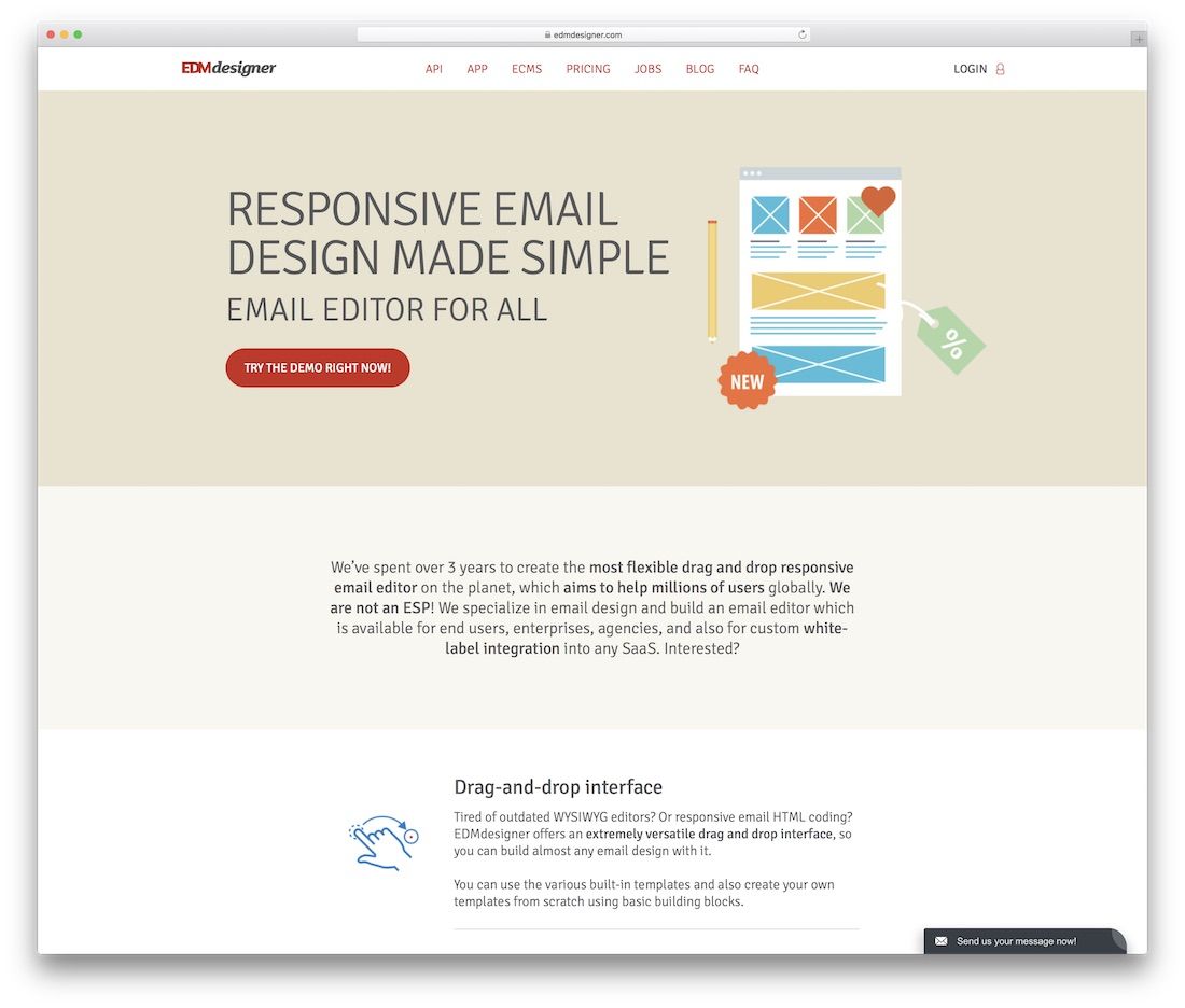 EDMDESIGNER est une société de messagerie qui a pris son temps pour se développer pleinement et s'adapter pleinement aux exigences de la communauté. Le résultat est une plate-forme sophistiquée de création d'e-mails utilisant une interface glisser-déposer. Il aide les concepteurs à faire ce qu'ils font le mieux, à savoir concevoir et, dans ce cas, concevoir des modèles d'e-mails, inutile de passer du temps à recréer le même contenu encore et encore. Avec EDMDESIGNER, vous pouvez enregistrer vos modèles d'e-mails et vos éléments préférés comme un bloc d'actualités, un en-tête de marque ou des informations de désabonnement et les réutiliser dans l'une de vos futures campagnes.