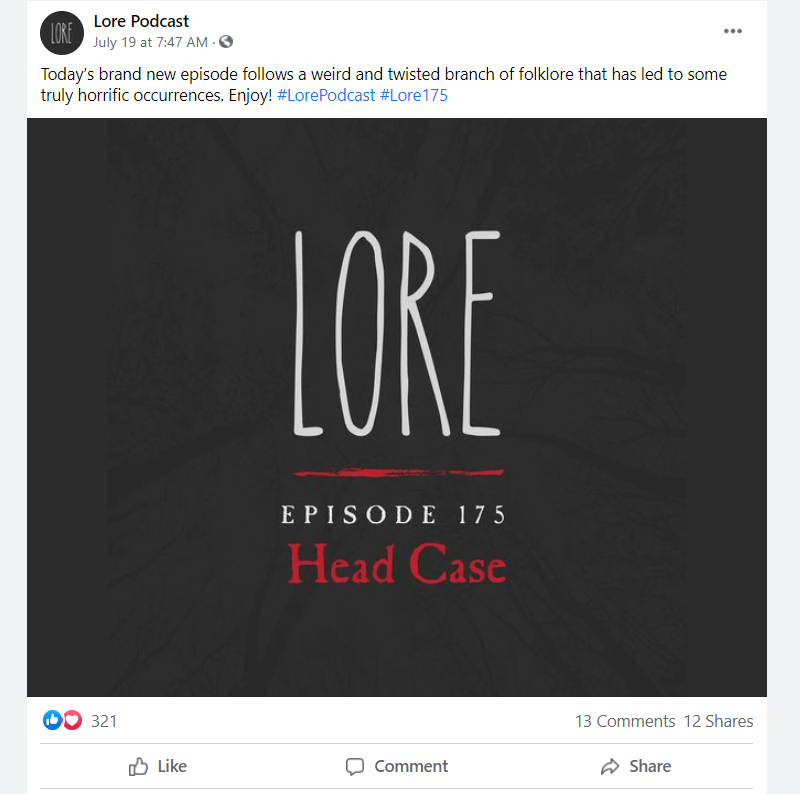 L'utilisation d'images accrocheuses peut être une stratégie simple mais efficace. Cela est particulièrement vrai si vous associez le contenu visuel à un slogan convaincant, comme le fait la page Facebook du podcast Lore :