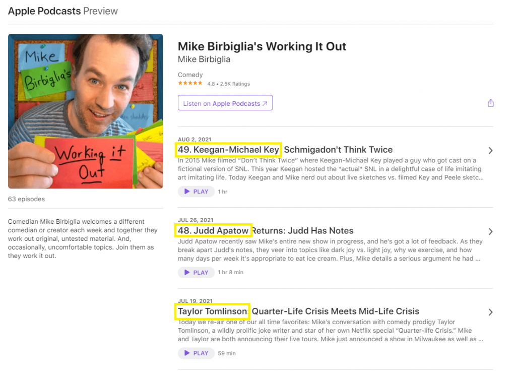 Une façon d'améliorer le référencement de votre podcast consiste à titrer vos épisodes avec les mots-clés pour lesquels vous souhaitez vous classer. Le podcast de Mike Birbiglia, qui présente un nouveau comédien chaque semaine, le fait en incluant les noms au tout début :