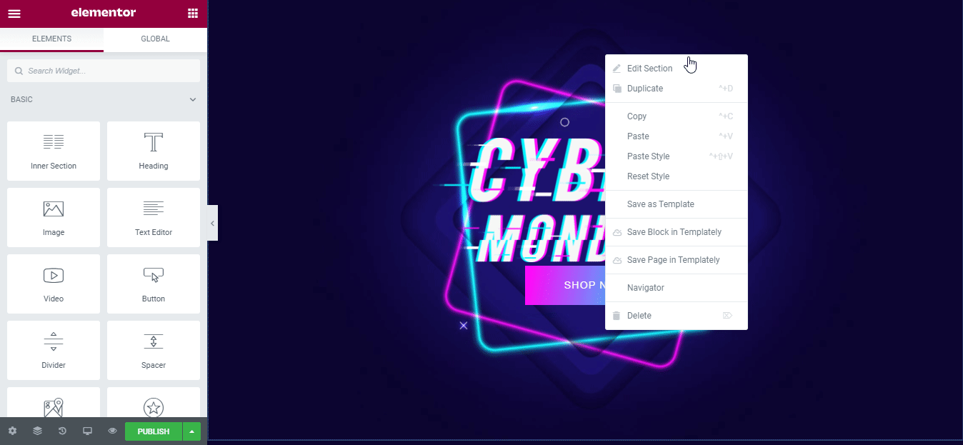 Vous pouvez désormais personnaliser entièrement la conception de la page d'accueil "CyberSell" Cyber Monday en ajoutant votre propre texte ou contenu visuel dans chaque section créative. Vous pouvez faire glisser et déposer une section dans une autre, insérer l'un de ses blocs prêts si nécessaire ou effectuer d'autres modifications pour la publier immédiatement.