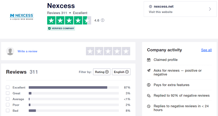 Nexcess obtient un score parfait de 4,6 étoiles sur 4 sur Trustpilot selon 311 utilisateurs. Super! De plus, 87% des utilisateurs déclarent qu'il est excellent.