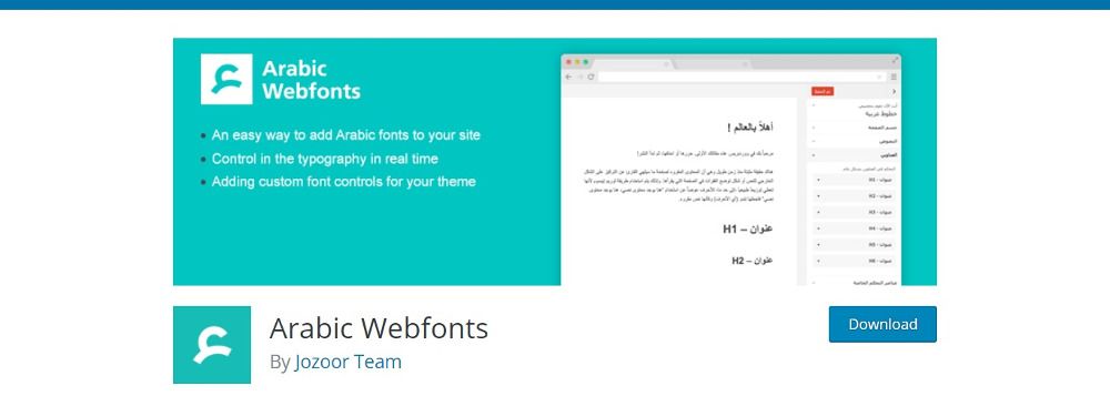 Arabic Webfonts est un autre plugin de qualité pour ajouter des polices arabes à votre site Web WordPress. Il ajoute des contrôles de police personnalisés pour votre thème et contrôle la typographie en temps réel. Il s'intègre à votre WordPress Customizer pour afficher les modifications de police même lorsque vous les effectuez. Il est compatible avec la plupart des thèmes WordPress standards.