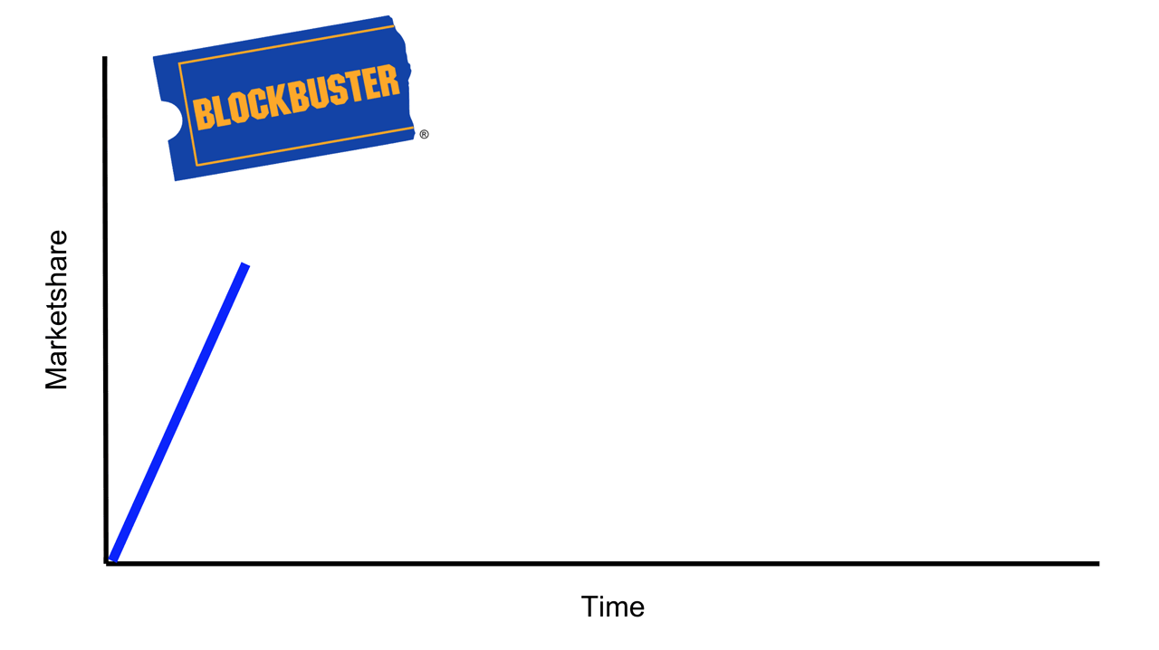 L'exemple classique de ceci est Blockbuster Entertainment, Inc. Ils avaient plus de 9 000 magasins à la fois, permettant aux gens de louer des cassettes VHS et plus tard, des DVD. Ils avaient une énorme part du marché à eux seuls et il semblait que personne ne pouvait rivaliser avec ce mastodonte.